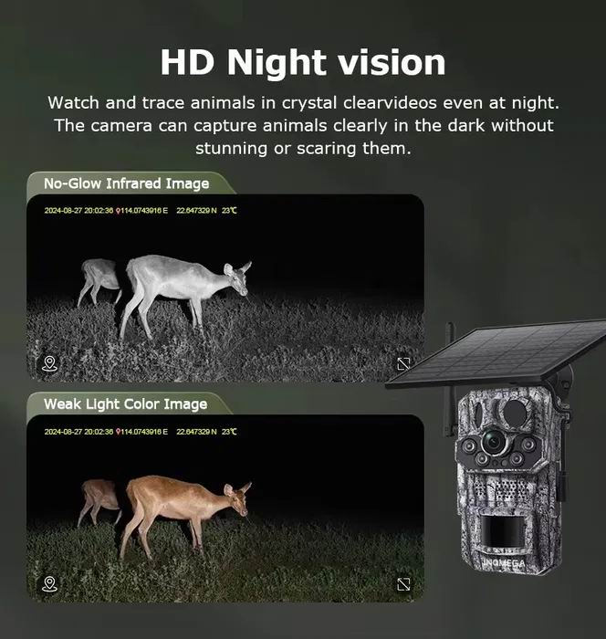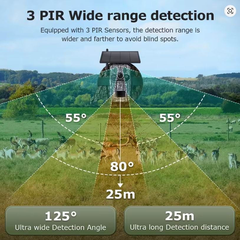 Фотопастка оснащена сонячною панеллю та вбудованим акумулятором, камера працює автономно, забезпечуючи безперебійне живлення без потреби у заміні батарей. Завдяки міцному та водостійкому корпусу з класом захисту IP66, пристрій чудово підходить для використання на відкритому повітрі — в лісах, на фермах, ранчо, будівництві чи в заміських будинках.