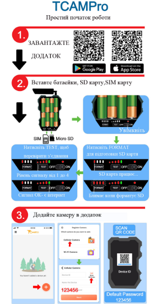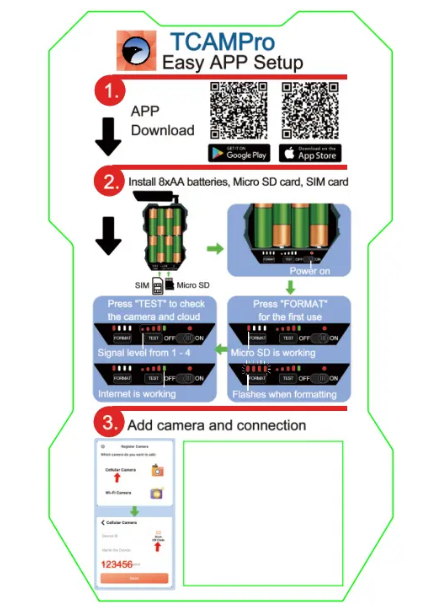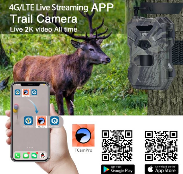 Фотопастку Suntek HC-880Pro не потрібно спеціально налаштовувати через програму, достатньо вставити батареї, SD карту, SIM-карту мобільного оператора, почекати 2-3 хвилини поки камера зареєструється в мережі, потім завантажити мобільний додаток SuntekCam або TCAMPRO (доступно для Android / iOS) і відсканувати QR код, який знаходиться усередині камери. У ньому можна переглядати матеріал, змінювати налаштування, робити запис у будь-який момент, завантажувати всі файли з камери на свій смартфон та багато іншого.